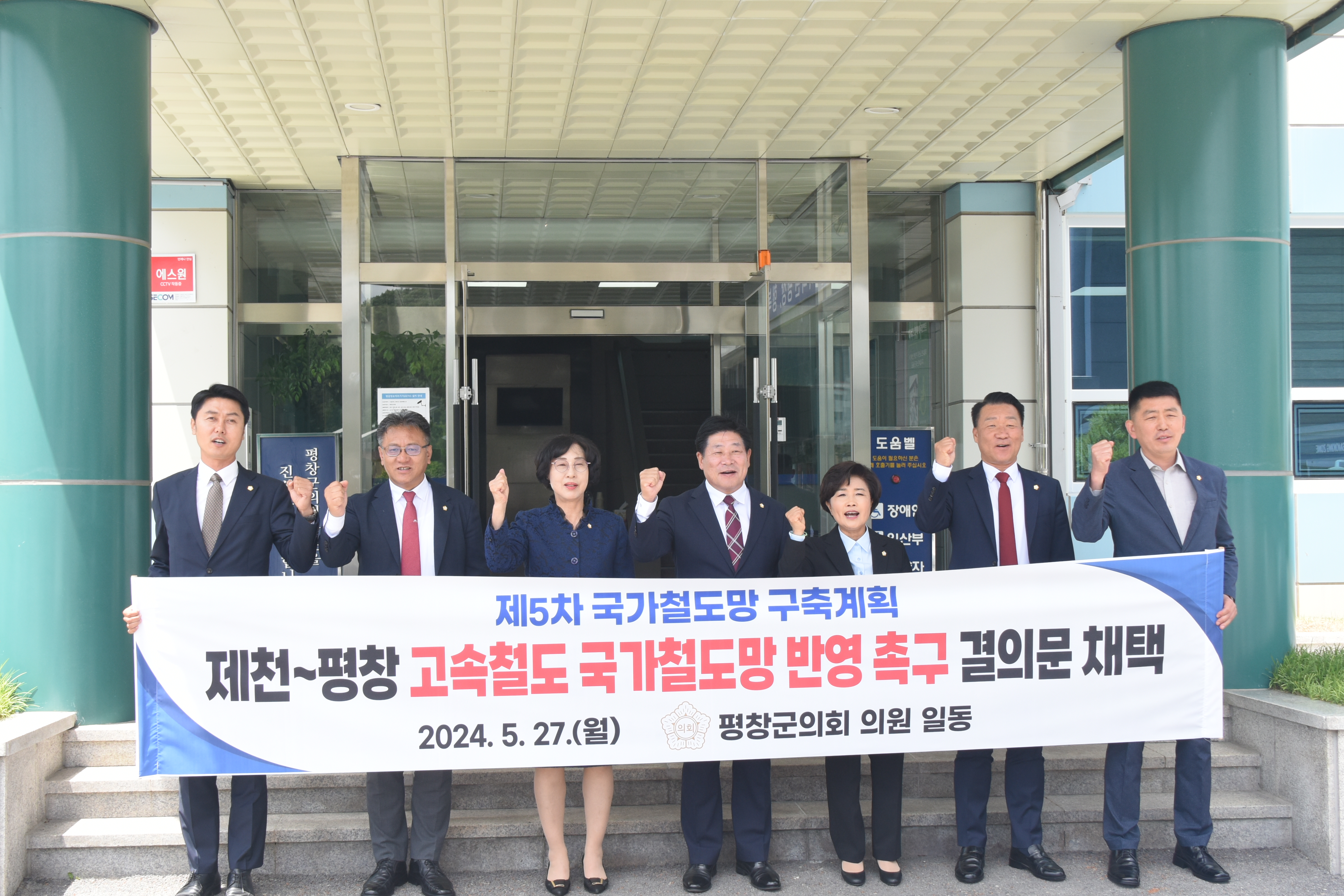 평창군의회(의장 심현정)는 5. 27.(월) 11시 제294회 평창군의회 임시회 제2차 본회의를 개의하여, 평창군의회 의원 전원이 공동발의한 ‘제천~평창 고속철도 국가철도망 반영 촉구 결의문 채택의 건’을 의결하고 결의문을 발표했다.