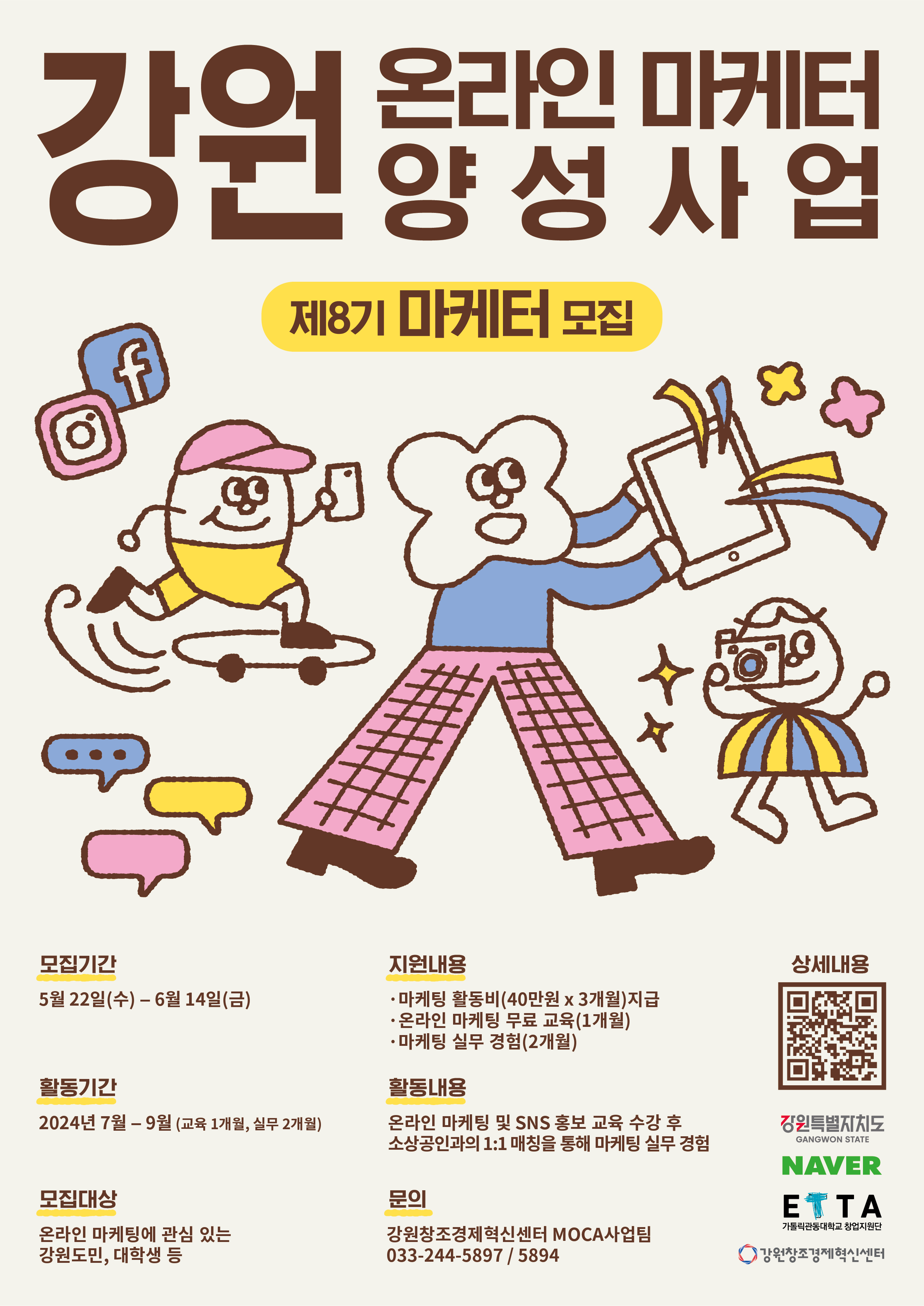 강원 온라인마케터 양성사업 8기는 오는 6월 14일까지 춘천, 원주, 강릉 3개 지역에서 45명의 예비 마케터와 50여 개의 소상공인 업체를 모집한다.