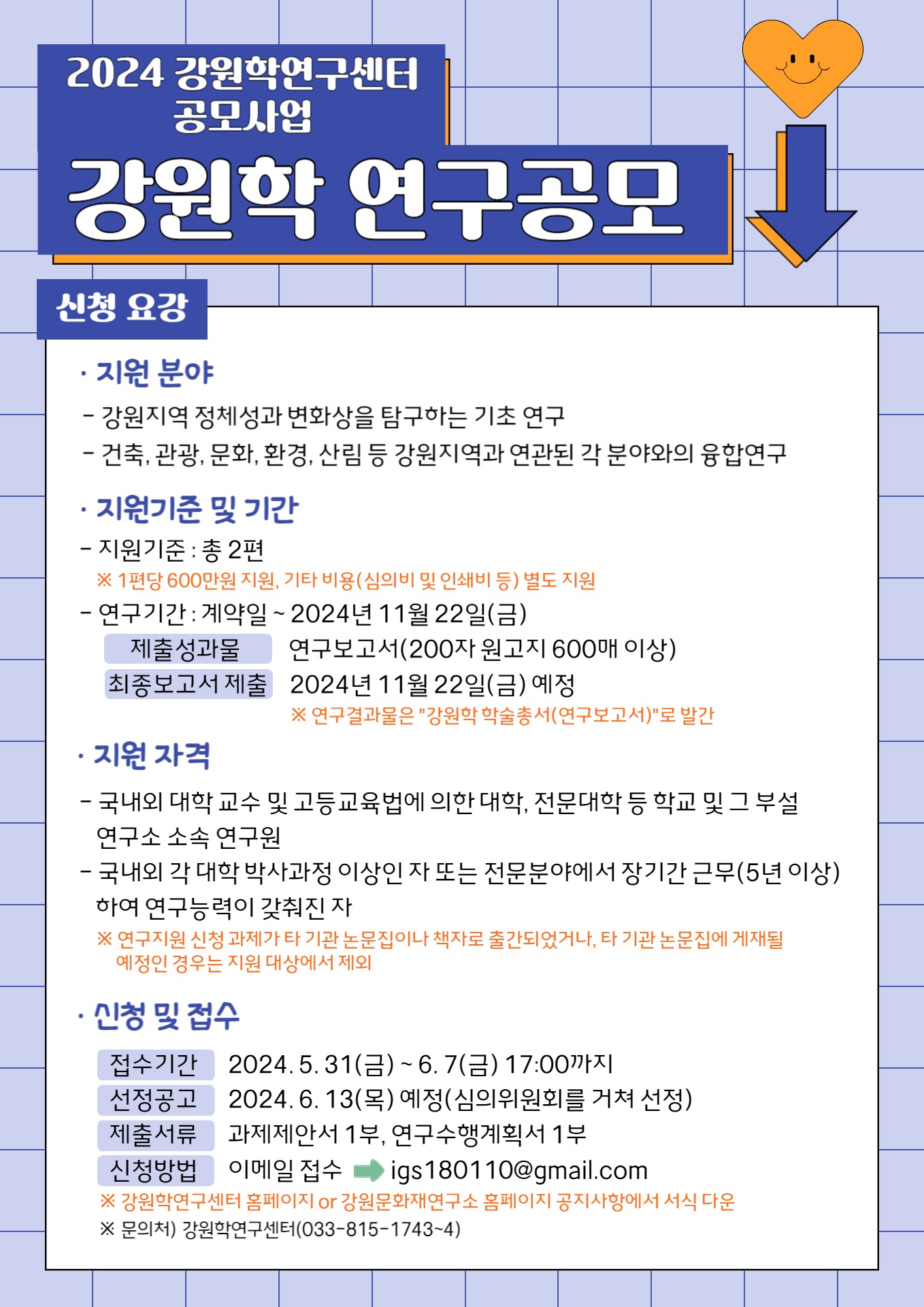 공모 접수기간은 5월 31일부터 6월 7일까지이며, 신청은 강원문화재연구소 홈페이지(http://www.gich.or.kr) 및 강원학연구센터 홈페이지(http://www.gangwonstudies.re.kr) 공지사항에서 신청서를 다운받아 강원학연구센터 이메일(igs180110@gmail.com)로 신청하면 된다.