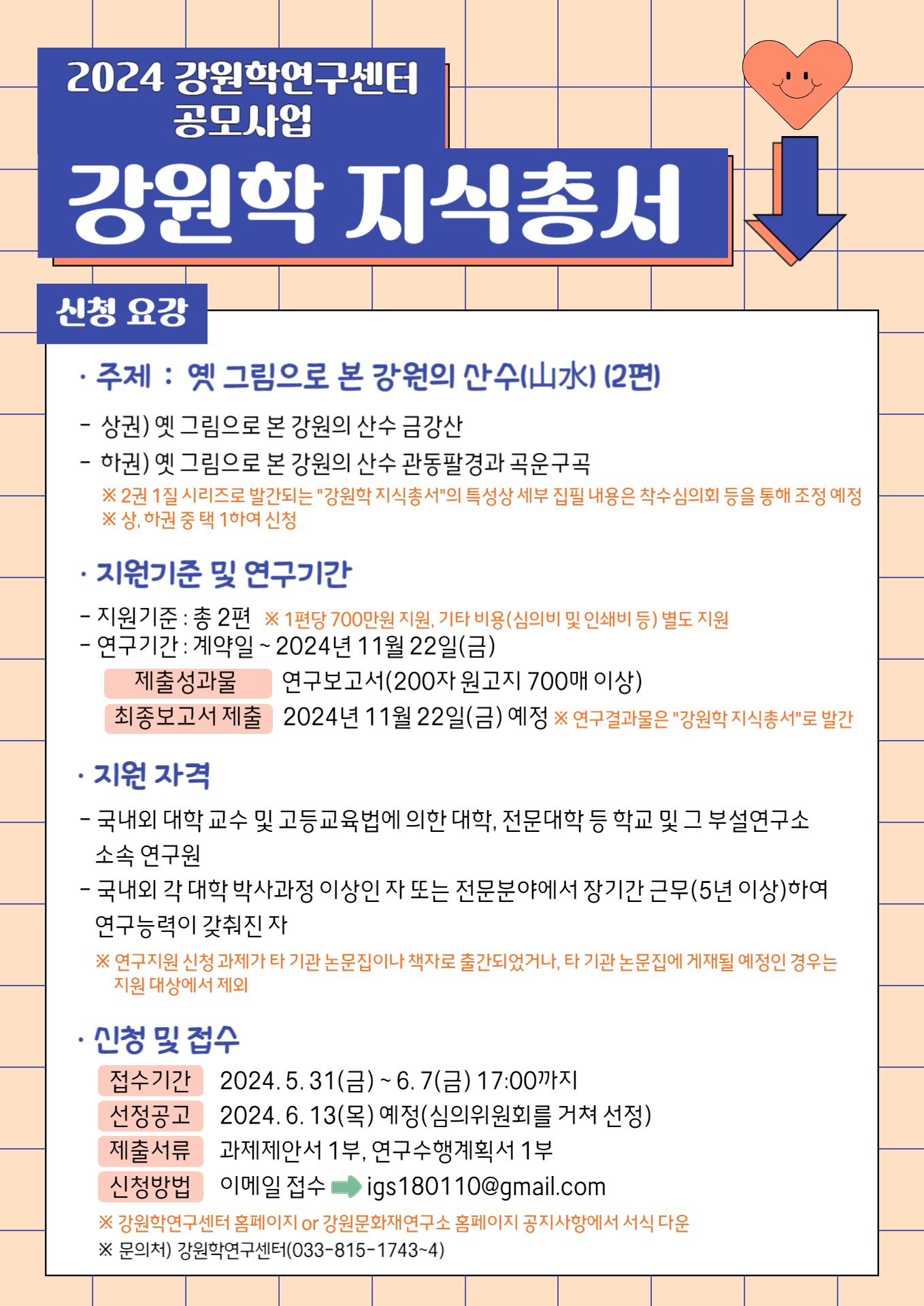 강원학 지식총서 공모사업은 총 2건을 지원한다. 연구주제는 ‘옛 그림으로 본 강원의 산수(山水)’로, 세부 주제는 금강산 편과 관동팔경과 곡운구곡 편이다.