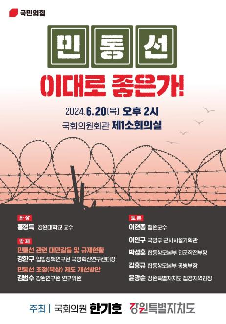 강원특별자치도․한기호 국회의원은 공동으로 ‘24. 6. 20.(목), 오후 2시, 국회의원회관에서 「민통선, 이대로 좋은가!」라는 주제로 토론회를 개최하였다.