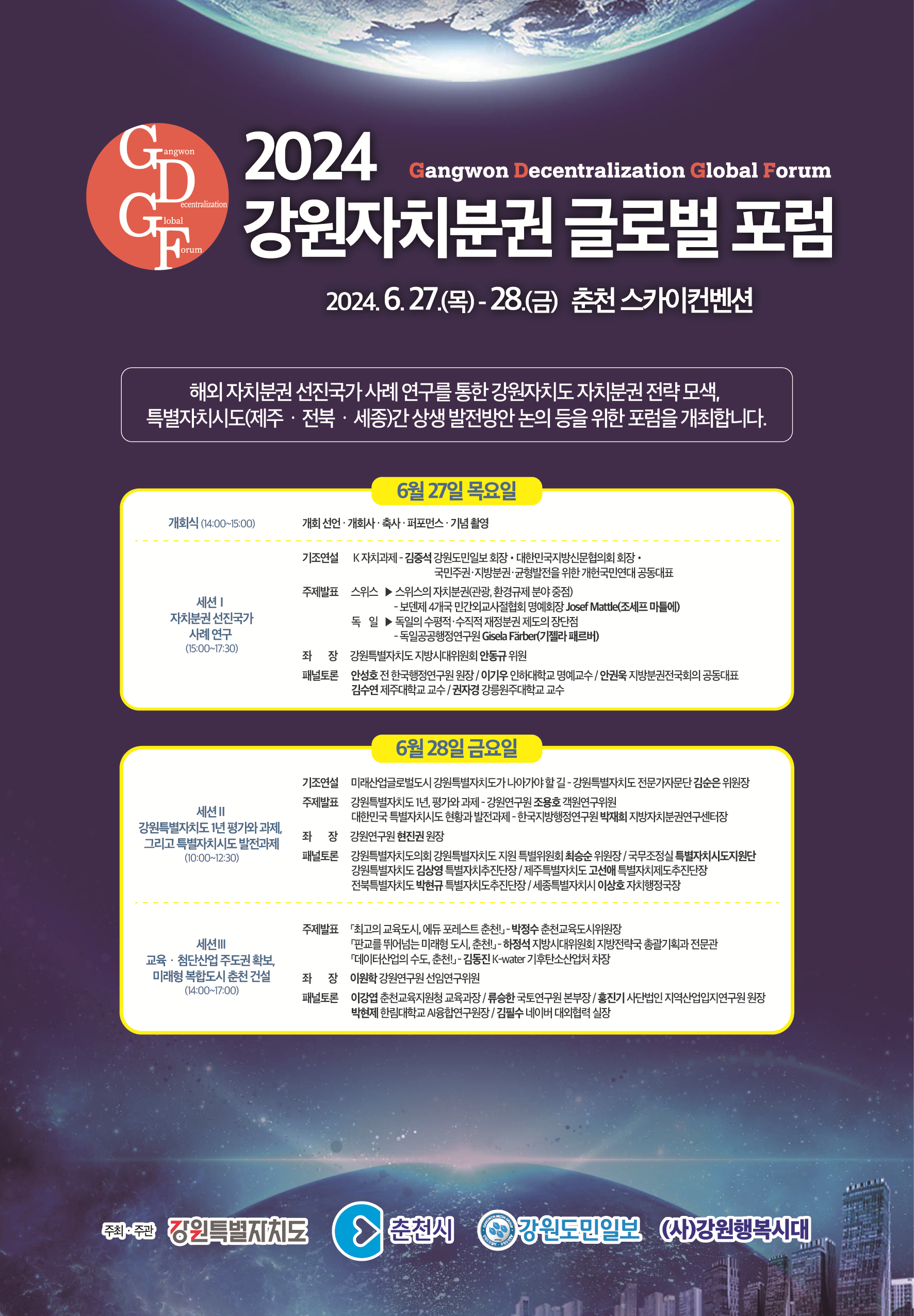 강원특별자치도, 춘천시, 강원도민일보, 강원행복시대는 자치분권 발전 전략을 모색하고 글로벌 상생협력 강화를 위해‘2024 강원 자치분권 글로벌 포럼(Gangwon Decentralization Global Forum)'을 개최한다.