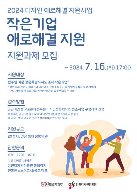 (재)강원디자인진흥원(원장 최인숙, 이하 진흥원)이 디자인 지원 사각지대에 놓인 도내 소재 기업의 고충을 해결하기 위해 「2024 작은기업 애로해결 지원사업」을 추진한다.