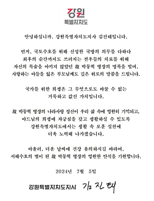김진태 강원특별자치도지사는 서한문을 통해, “국토수호를 위해 신성한 국방의 의무를 다하다 최후의 순간까지도 쓰러지는 전우들의 치료를 위해 자신의 목숨을 아끼지 않았던 고(故) 박동혁 병장의 안식을 기원한다”고 위로의 말씀을 전하고,
