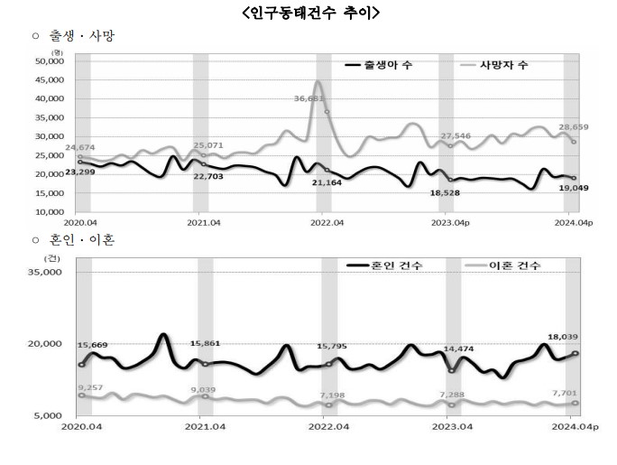 통계청에 따르면 2024년도 4월 출생아 수는 19,049명으로 전년동월대비 2.8% 증가, 사망자 수는 28,659명으로 전년동월대비 4.0% 증가, 혼인 건수는 18,039건으로 전년동월대비 24.6% 증가, 이혼 건수는 7,701건으로 전년동월대비 5.7% 증가한 것으로 나타났다.