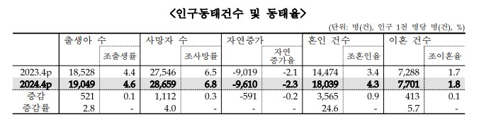 통계청에 따르면 2024년도 4월 출생아 수는 19,049명으로 전년동월대비 2.8% 증가, 사망자 수는 28,659명으로 전년동월대비 4.0% 증가, 혼인 건수는 18,039건으로 전년동월대비 24.6% 증가, 이혼 건수는 7,701건으로 전년동월대비 5.7% 증가한 것으로 나타났다.