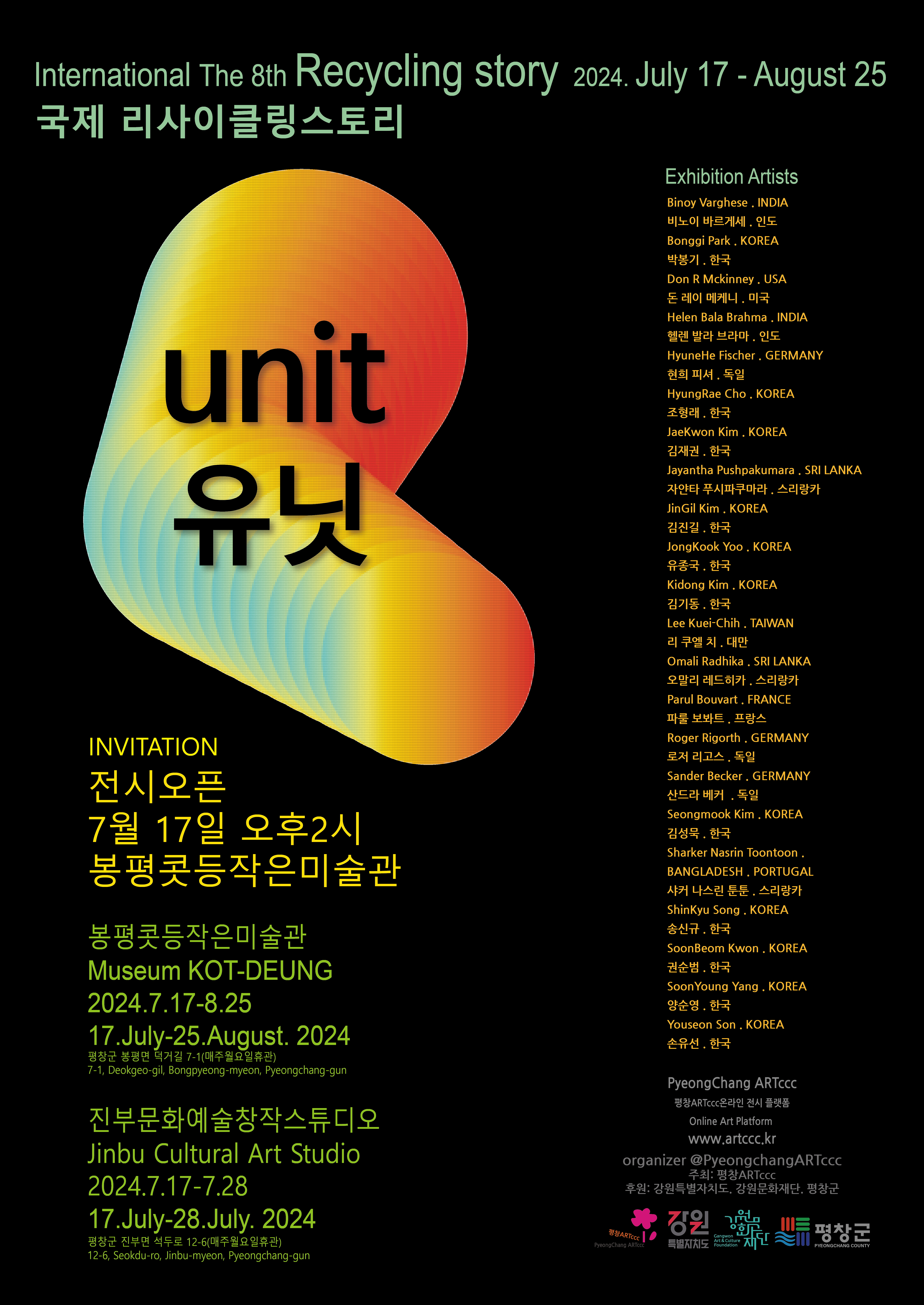 2024년 unit유닛에 참여하는 작가는 한국 작가 11명, 해외작가 11명으로 Binoy Varghese 비노이 바르게세(INDIA). Bonggi Park 박봉기(KOREA). Don R Mckinney 돈 레이 메케니(USA). Helen Bala Brahma 헬렌 발라 브라마(INDIA). HyuneHe Fischer 현희 피셔(GERMANY). HyungRae Cho 조형래(KOREA). JaeKwon Kim 김재권(KOREA). Jayantha Pushpakumara 자얀타 푸시파쿠마라(SRI LANKA). JinGil Kim 김진길(KOREA). JongKook Yoo 유종국(KOREA). Kidong Kim 김기동(KOREA). Lee Kuei-Chih 리 쿠엘 치(TAIWAN). Omali Radhika 오말리 레드히카(SRI LANKA). Parul Bouvart 파룰 보봐트(FRANCE). Roger Rigorth 로저 리고스(GERMANY). Sander Becker 산드라 베커(GERMANY). Seongmook Kim 김성묵(KOREA). Sharker Nasrin Toontoon 샤커 나스린 툰툰(BANGLADESH. PORTUGAL). ShinKyu Song 송신규(KOREA). SoonBeom Kwon 권순범(KOREA). SoonYoung Yang 양순영(KOREA). Youseon Son 손유선(KOREA) 총22명 이다.