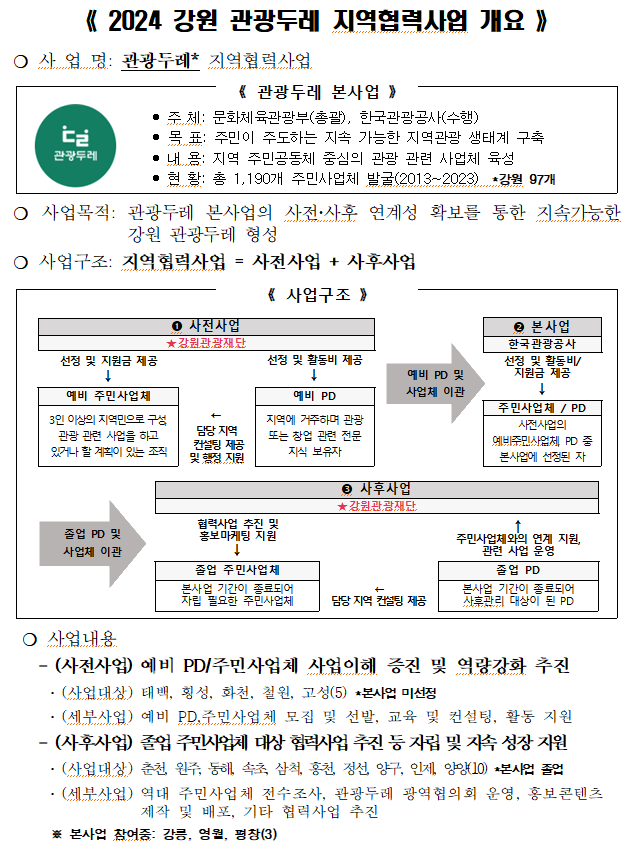 강원특별자치도와 강원관광재단(대표이사 최성현)이 ‘2024 강원 관광두레 지역협력사업’에 참여할 신규 PD와 주민사업체를 모집한다.