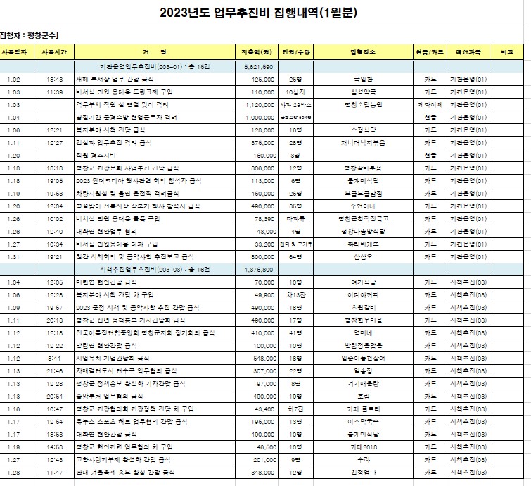 평창군의 2023년 1월, 군수 업무추진비 집행내역 분석 결과, 주요 지출 항목은 시책 추진과 직원 복지에 집중된 것으로 나타났다. 이러한 지출 구조는 지역 발전과 군정 목표 달성에 기여하는 한편, 개선이 필요한 부분도 지적되고 있다.
