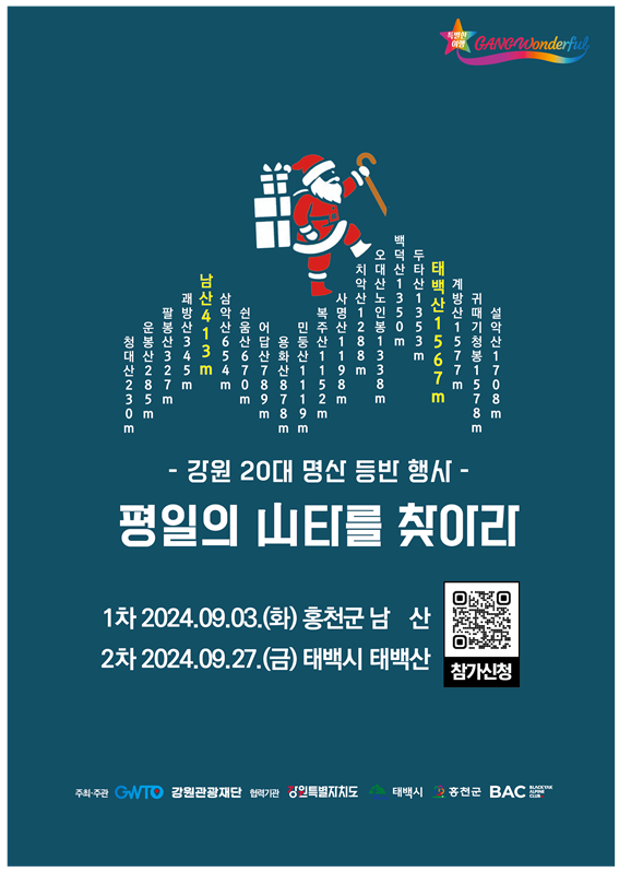 강원특별자치도와 강원관광재단(대표이사 최성현)은 강원 20대 명산 등반 인증 캠페인 사업의 일환으로 평일의 타를 찾아라행사를 오는 9월 개최한다고 밝혔다.