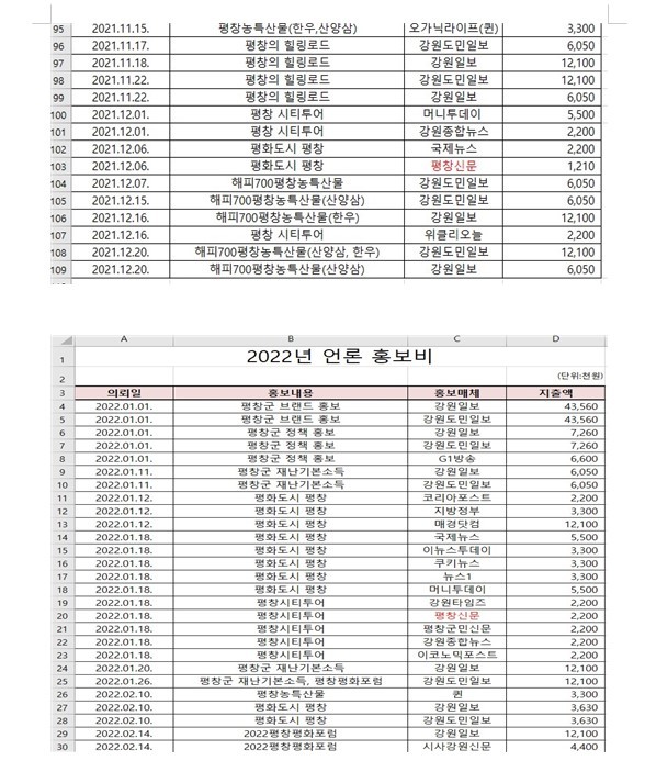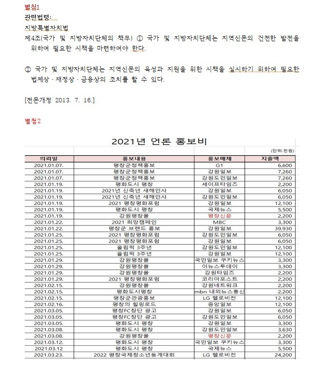 이어 "지역 신문은 군정과 주요 시책에 집중하여 홍보 효과를 극대화할 수 있도록 매체 선정 시 엄격한 기준을 적용해 달라"고 제안하며 지역의 시책 홍보는 평창신문이나 평창군민신문에 할 것"을 제안 했다.