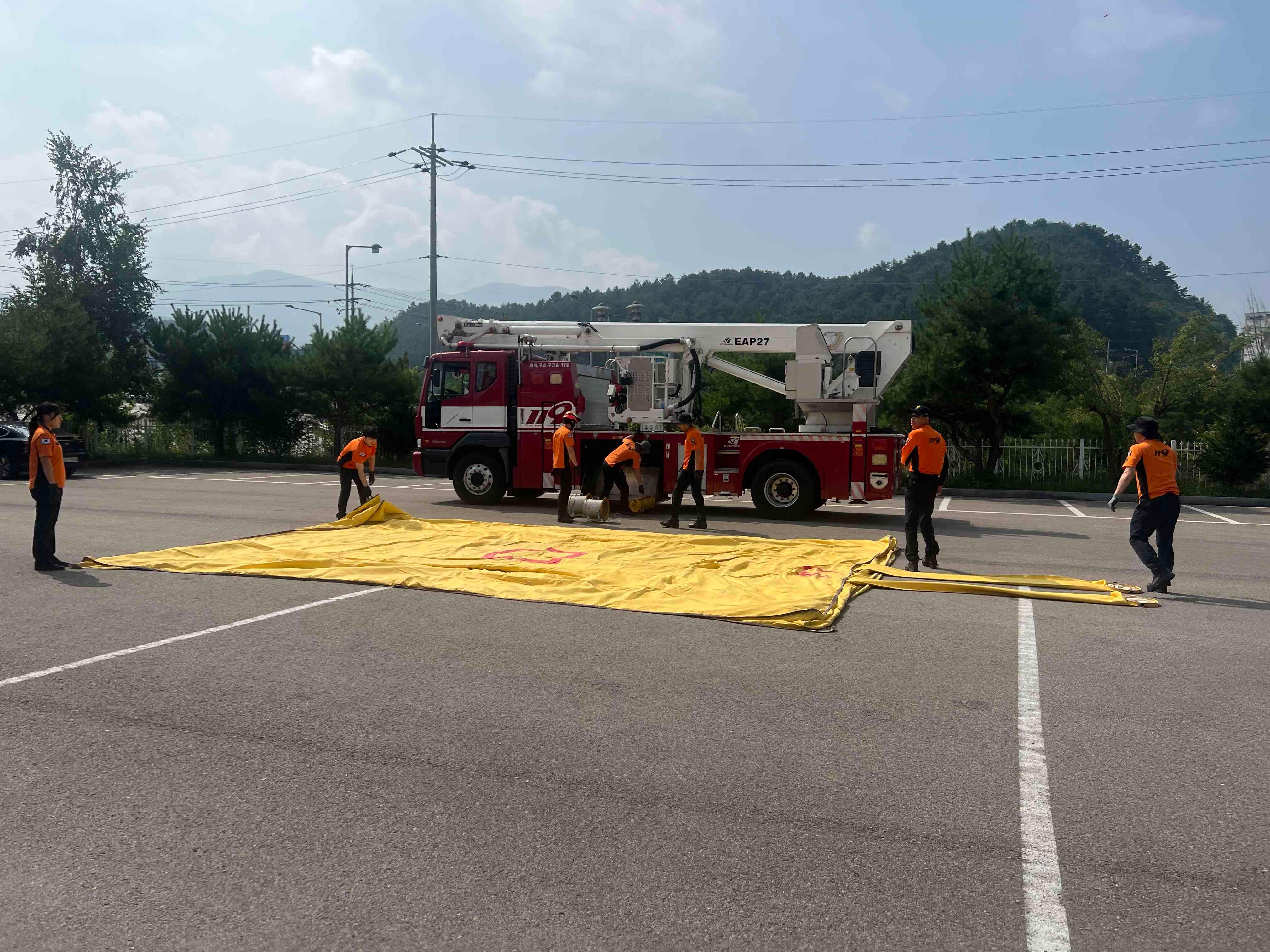 주요 훈련 내용은 에어매트 전개 및 설치 훈련 20m 이하 높이에서 마네킹을 활용한 탈출 훈련 에어매트 사용 매뉴얼 숙지 안전사고 방지 교육 등이다.