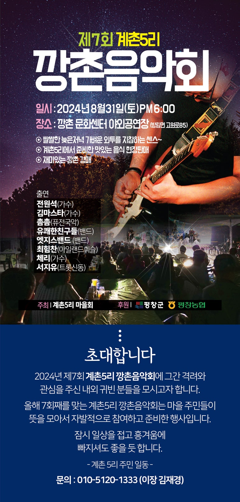 계촌5리 김재경 이장은 “마을 주민 모두가 한마음이 되어 열심히 축제를 준비하고 있다.”라며, “뛰어난 음악 재능기부자들이 함께하는 ‘제7회 계촌5리 깡촌음악회’에 많은 분이 오셔서 여름의 끝자락에서 음악과 함께 시원한 시간을 보내시기를 바란다.”라고 전했다.