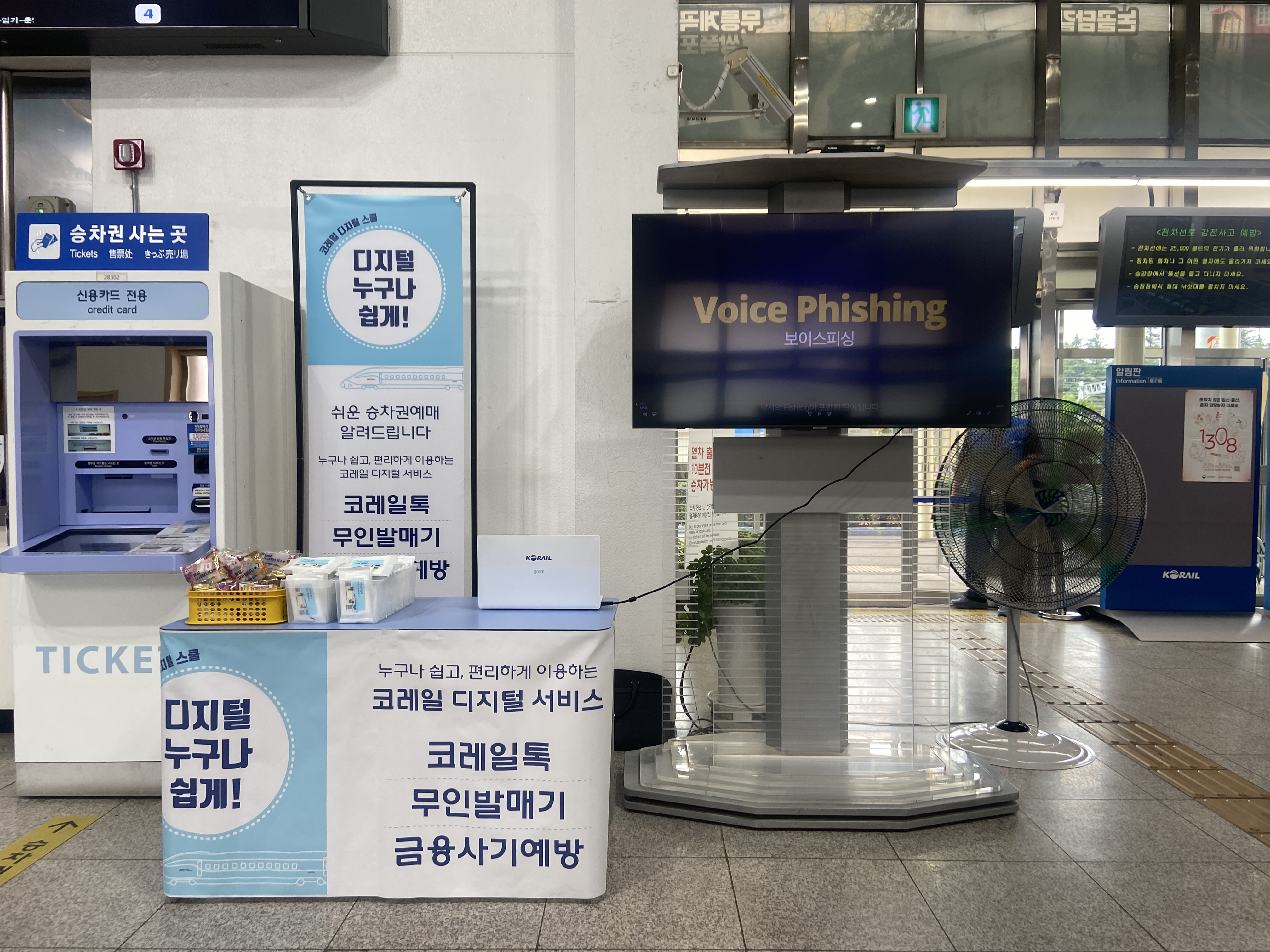 동해역 직원들은 맞이방에서 시청각 자료를 이용해 코레일톡(앱) 설치 방법과 기차표 예매 방법, 자동 발매기 사용법, 디지털 금융사기 예방법을 안내했다.