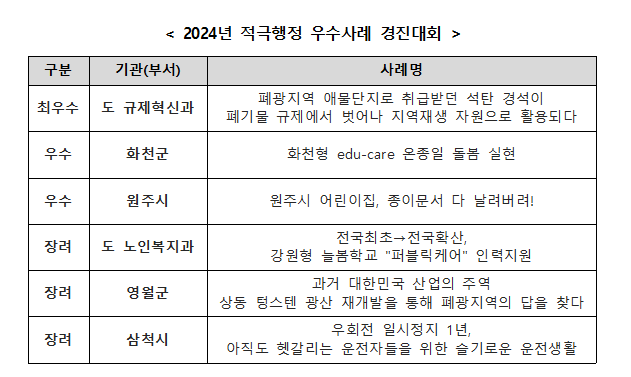 그 결과, (최우수상)에 “석탄 경석 폐기물 규제 개선” 사례를 발표한 도 규제혁신과가 선정되었으며, (우수상)에는 화천군과 원주시가, (장려상)에는 도 노인복지과, 영월군, 삼척시가 선정되어 수상의 영예를 안았다.