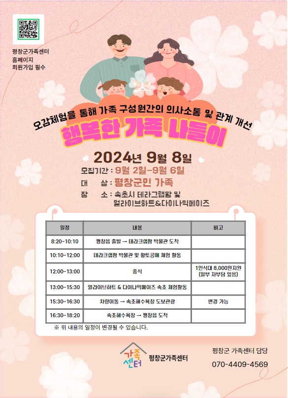평창군가족센터(센터장 최미자)에서는 “행복한 가족 나들이” 사업을 평창군민 가족을 대상으로 9월 8일에 1회기 실시할 예정이다.