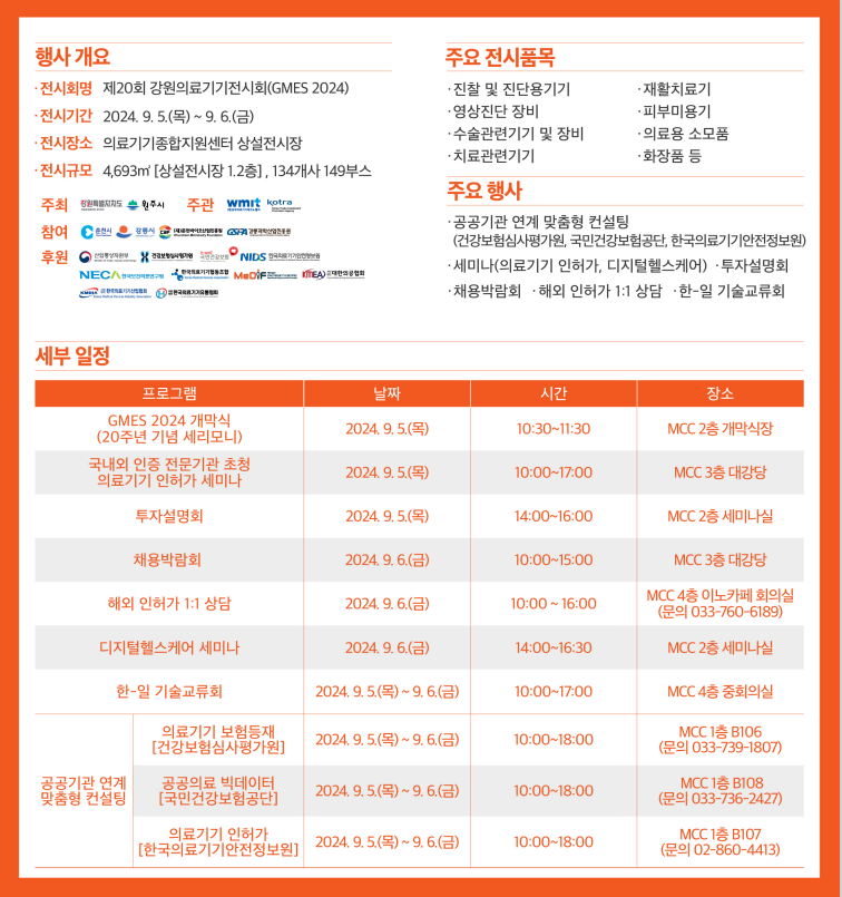 | ※제20회 강원 의료기기 전시회 (GMES* 2024) 개최개요 *Gangwon Medical Equipment Show ◦ (기 간)‘24. 9. 5. ~ 9. 6. ◦ (장 소) (재)원주의료기기테크노밸리 상설전시장(1~2층) ◦ (관계기관) 도·원주시주최, 원주의료기기테크노밸리·코트라주관 * 참여 : 춘천·강릉시, 춘천바이오산업진흥원, 강릉과학산업진흥원 ◦ (규 모) 기업·기관 134개사, 바이어 110여 명, 일반관람 1,000여 명 ◦ (주요내용) 전시장 운영, 해외 바이어 초청 및 기업 수출상담회, 투자설명회, 채용박람회, 의료 공공기관 연계 기업컨설팅 등 |