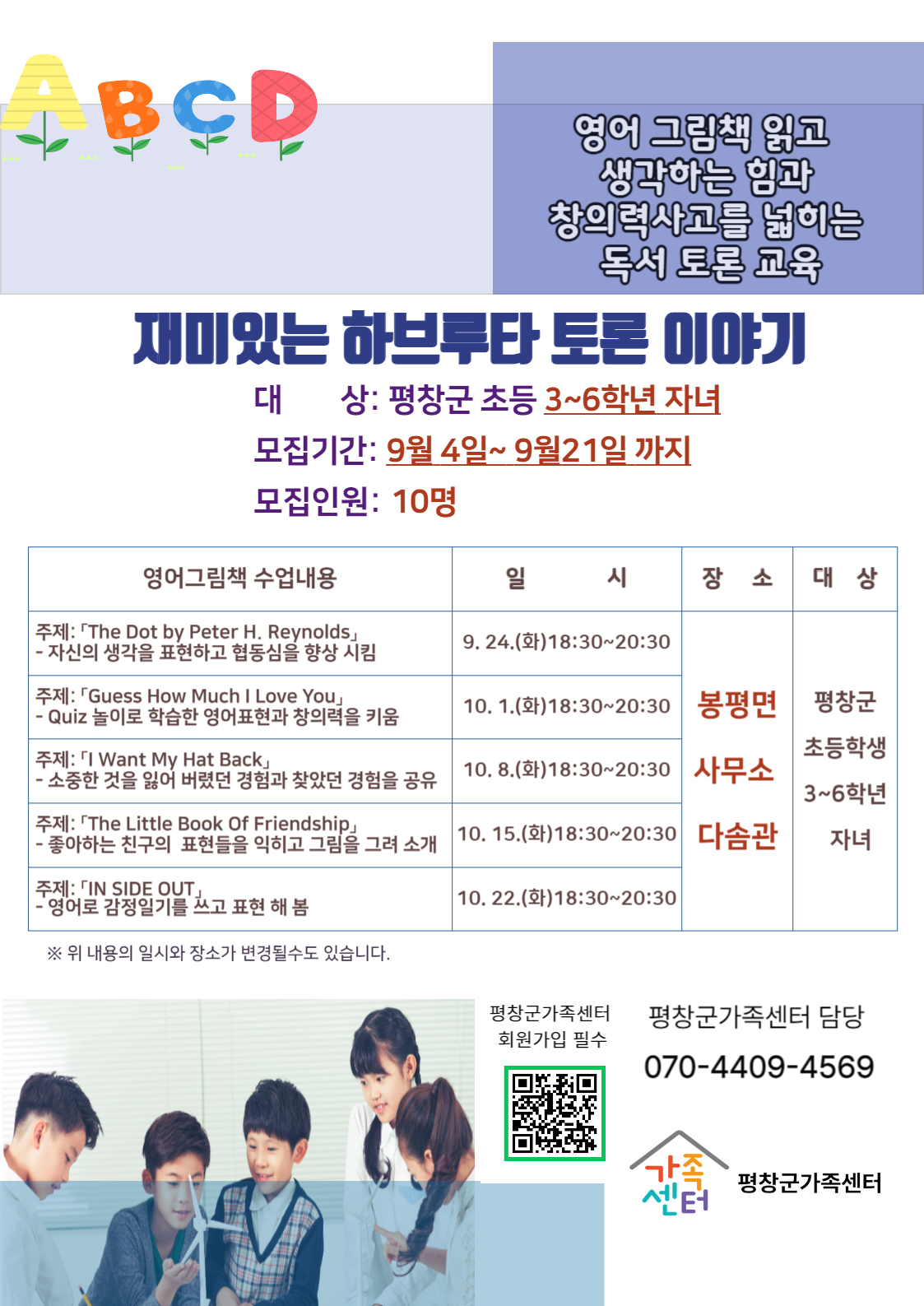 평창군가족센터(센터장 최미자)에서는 “재미있는 하브루타 토론이야기”사업을 9월 24일 화요일 부터 봉평면사문소 다솜관에서 평창군 초등학교 3~6학년 자녀를 대상으로 5회기 진행할 예정이다.