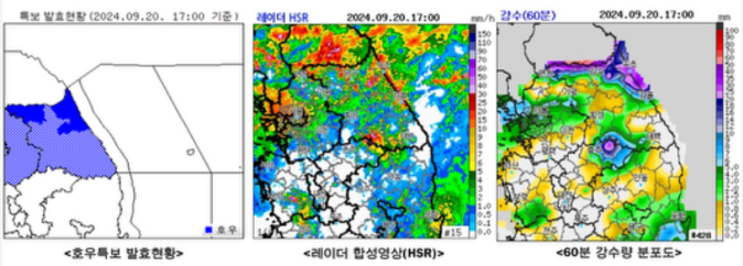 또한, 20일(금) 오전 10시에는 철원군에 호우주의보가 발효되었으며, 오후(12~18시)에는 도내 17개 시군 전역에 호우 예비특보가 발효되어 있는 상황이다.