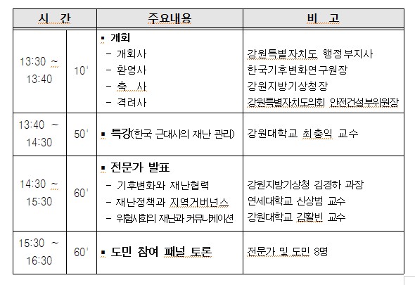 토론회는 강원대학교 최충익 교수의 ‘한국 근대사의 재난재해’ 특강을 시작으로 강원지방기상청 김경하 기후서비스과장과 연세대학교 신상범 교수, 강원대학교 김활빈 교수가 강원특별자치도의 기후변화와 재난재해에 대해서 발표한다. 이어지는 도민 참여 패널토론에서는 한림성심대학교 강영복 교수 등 8명의 토론자가 참여하여 우리 지역의 재난‧방재에 대하여 의견을 나눌 예정이다.