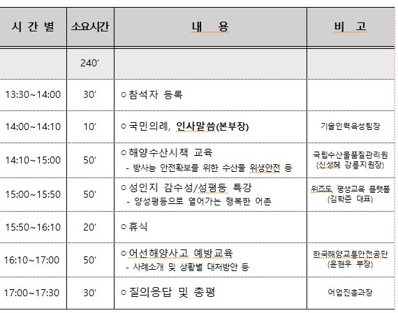 이번 협의회는 도 단위 및 시군단위 협회장과 여성어업인 대표 등 총 63명을 대상으로, 수산물 위생안전교육, 성인지 감수성·성평등 교육, 어선해양사고 예방교육 등의 강의가 진행될 예정이다. 또한 어업인들의 현장 의견을 수렴하여 정책에 반영하는 기회도 마련된다.
