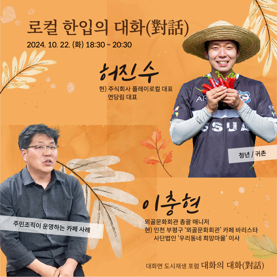 오는 22일에는 로컬 한입의 대화라는 주제 2차 포럼이 진행되며, 인구소멸 위기 지역인 경북 영양군에서 숙박시설과 카페를 운영하는 허진수 연당림 대표와 주민조직단체가 운영하는 인천 뫼골문화회관의 이충현 매니저를 초빙하여 사례를 공유하는 자리를 갖는다.