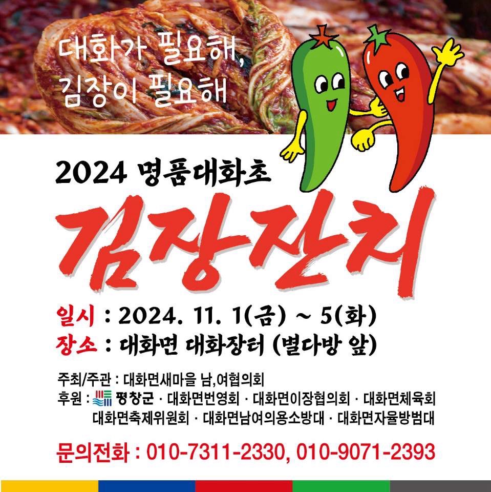 평창군은 ‘제3회 명품 대화초 김장잔치’를 11월 1일부터 5일까지 5일간 대화면 전통시장 일원에서 개최한다고 밝혔다. 이번 행사를 주최하는 대화면 남녀새마을협의회는 아삭함과 맵기가 일품인 대화초와 해발 700m의 일교차와 지리적 특성으로 단맛이 강한 평창군 고랭지 배추를 주원료로 한 김치 판매, 김장 체험, 지역 특산물 판매 등 다양한 행사를 진행할 계획이다.