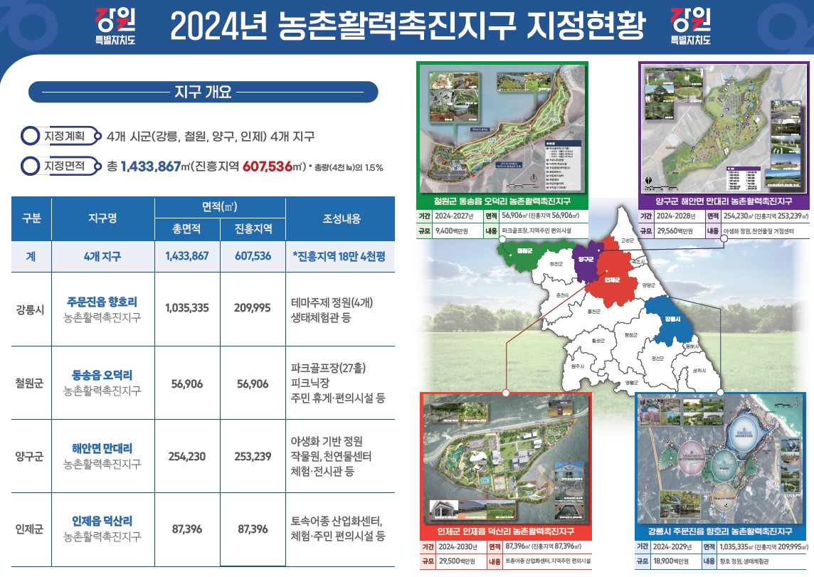 농촌활력촉진지구 지정으로, 강릉 향호 지방정원, 철원 학저수지 체육시설, 양구 해안면 지방정원, 인제 토속어종 산업화센터 등이 조성될 계획이다. 총 사업부지 143헥타르 중 61헥타르(43%)는 농업진흥지역으로, 도지사 권한으로 해당 농지를 직접 해제할 수 있게 되어 신속한 사업 추진이 가능해졌다.