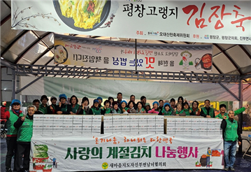 진부면새마을지도자남녀협의회(회장 전경주, 차성자)1118일 진부면 송어축제장에서 사랑의 김장 나눔 행사를 열고 정성껏 담근 김장김치 400박스(2,000kg)를 지역 내 홀몸 어르신과 저소득층 등 400명에게 전달했다.