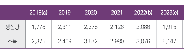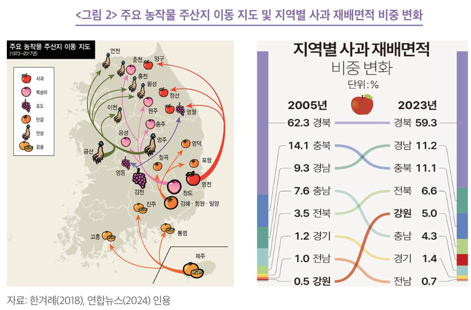 사과의 주산지였던 경북의 평균기온은 지난 45년 동안 0.63℃ 상승해 아열대 기후로 변화 중이고 ´22년 월 평균기온이 8개월 이상 10℃를 웃도는 등 이미 아열대 기후에 진입한 상태로서 사과 재배면적이 점차 줄고 있는 추세이다.