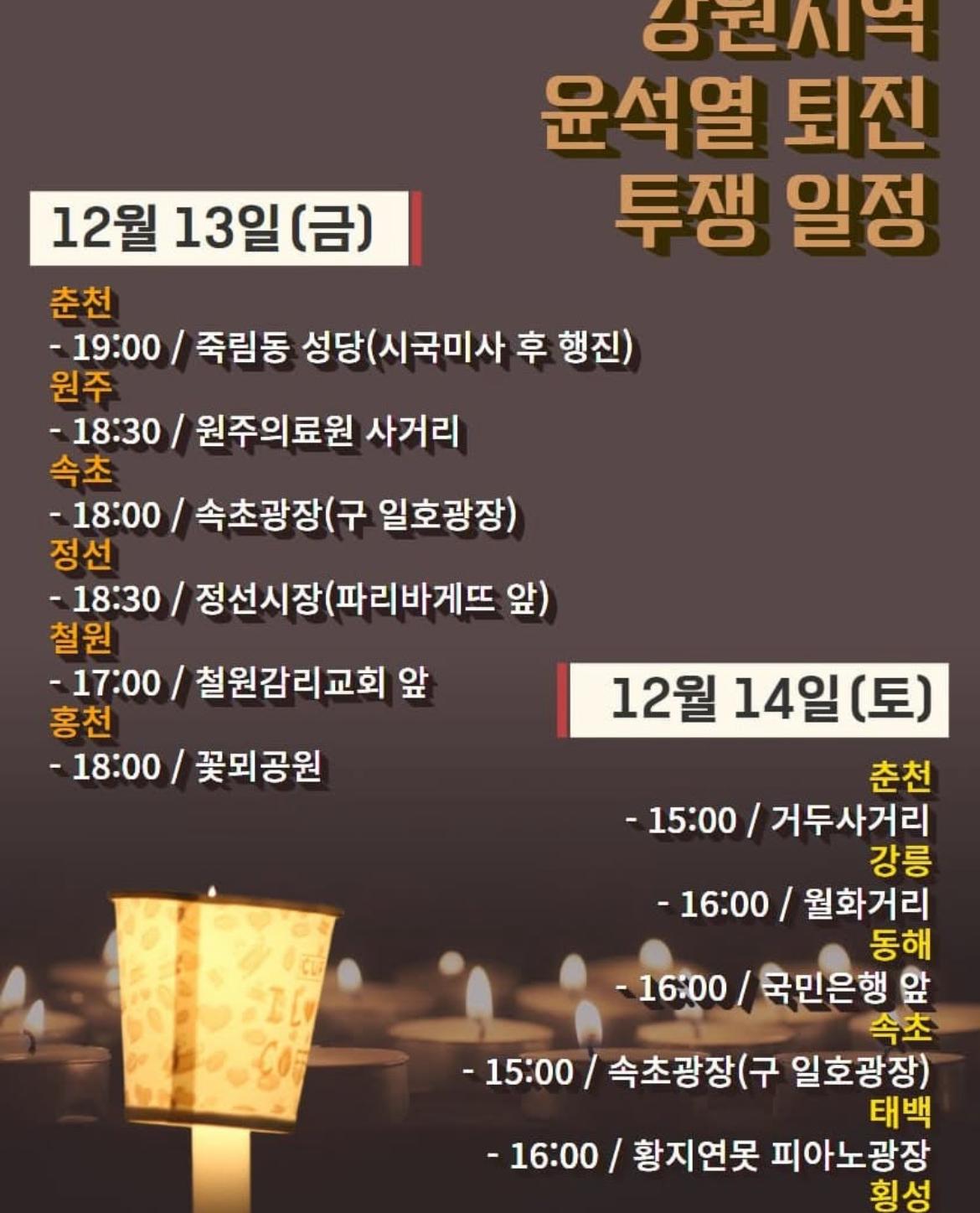 윤석열 퇴진  투쟁이 강원도에서도 각 지역에서 실시되고 있다. 춘천 원주 속초 정선 철원 홍천 강릉 동해 태백 횡성에서 일정이 진행되고 있다. 양구는 지난 11일 윤석열 퇴진 운동을 벌였다. 평창 영월 삼척 인제 고성 화천 양양은 윤석열 퇴진 투쟁 일정이 없는 것으로 보인다.