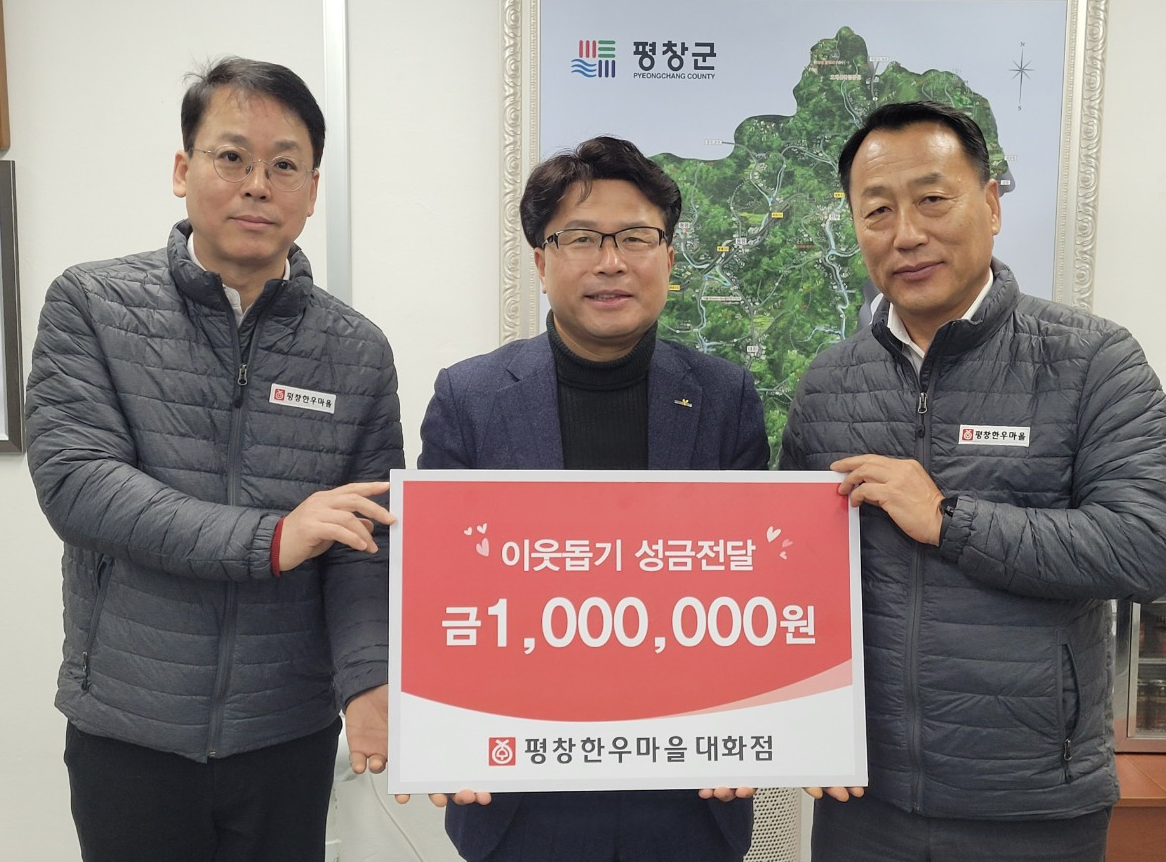평창한우마을 대화점(지점장 최철근)은 지난 12월 24일, 직원들이 십시일반 모은 성금 100만 원을 대화면사무소에 기탁하며 지역사회의 어려운 이웃을 돕는 따뜻한 나눔을 실천했다.