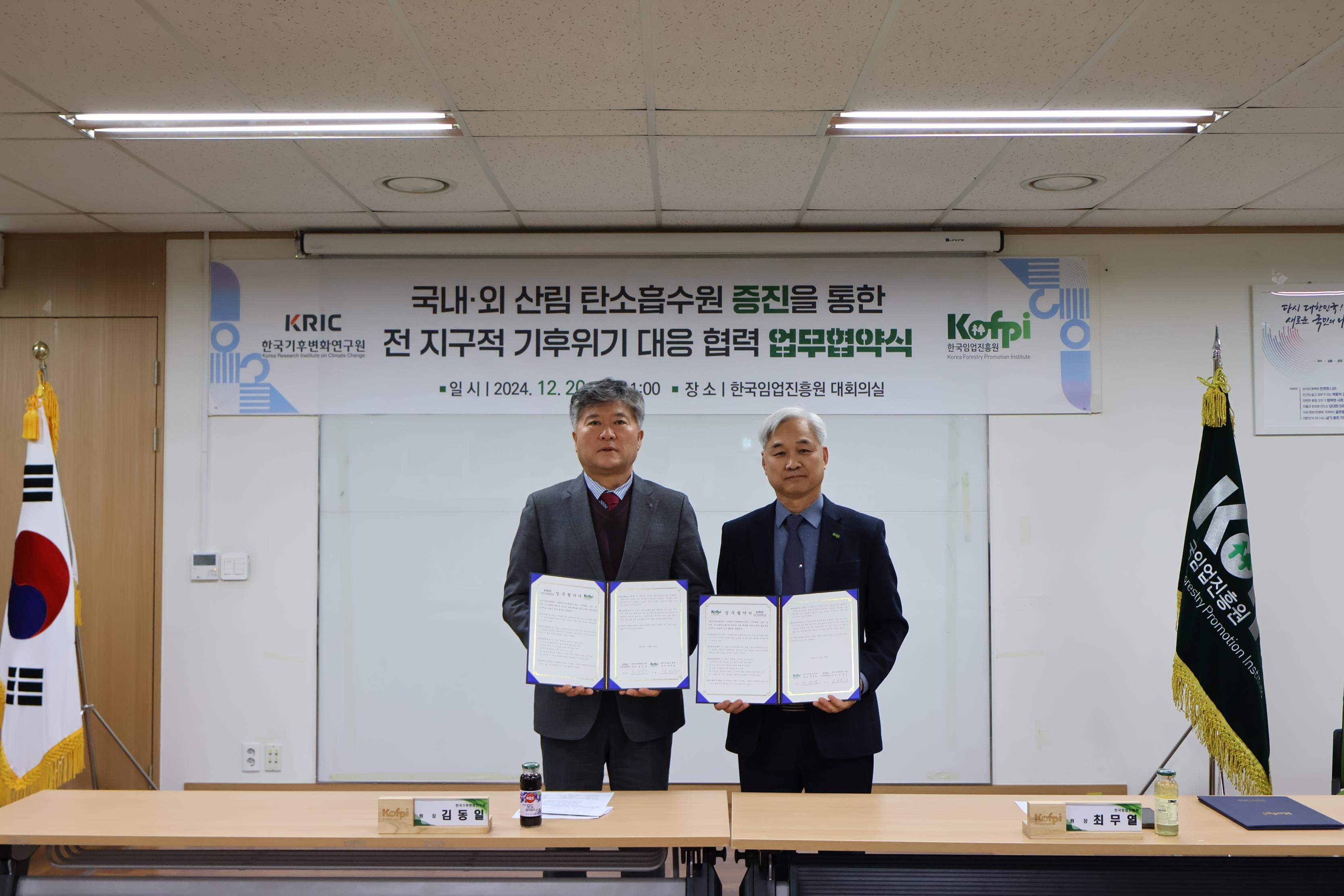 한국기후변화연구원(원장 김동일)은 12월 20일(금), 한국임업진흥원(원장 최무열)과 함께 기후변화 대응 및 산림 탄소흡수원의 유지·증진을 위한 업무협약(MOU)을 체결했다고 밝혔다.