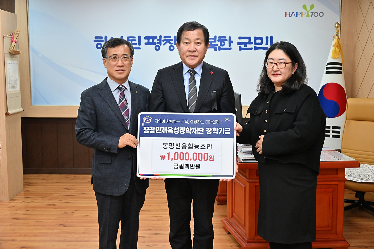 봉평 신용협동조합은 사회공헌활동으로 2014년부터 평창인재육성장학재단에 장학금을 전달 해오며 현재 누적 기부 장학금이 1,400만 원에 달한다.