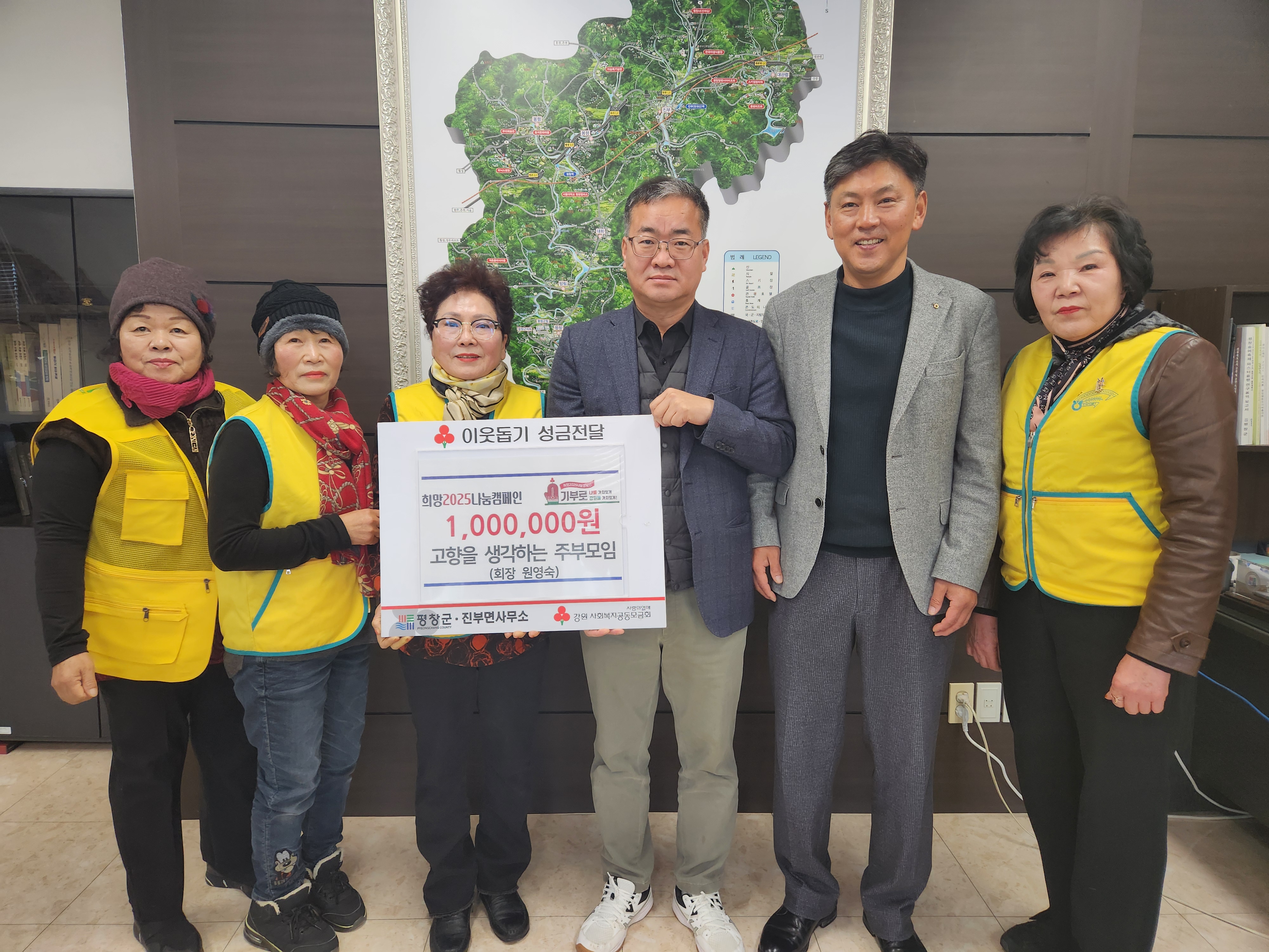평창군 진부면 고향을 생각하는 주부들의 모임(회장 원영숙)10() 진부면사무소를 방문하여 어려운 이웃돕기 성금 100만 원을 전달했다.