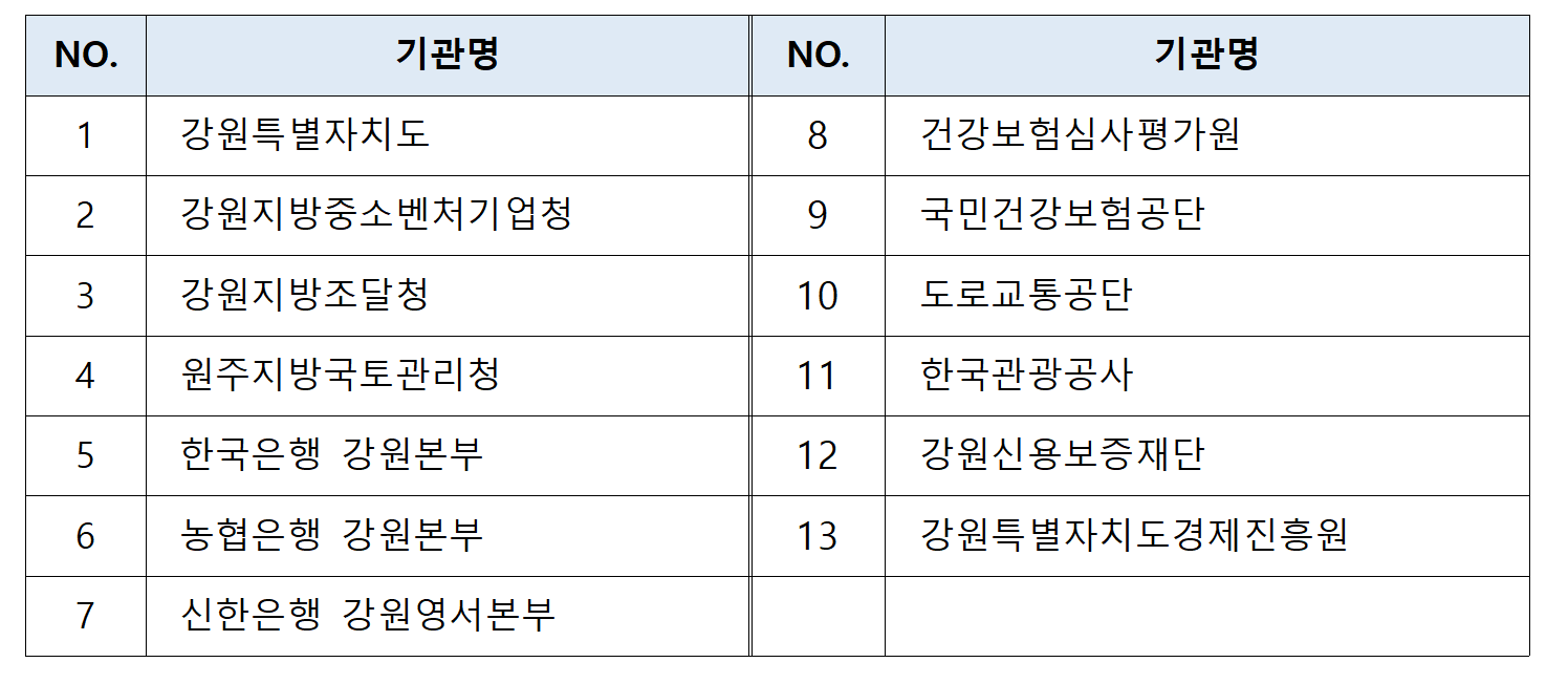 이를 위해 도내 경제 분야 특별지방행정기관과 도 출자․출연기관, 주요 은행, 주요 강원혁신도시 이전기관 등 13개 기관이 참석하여 힘을 보탰다.