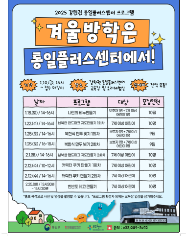 통일부 및 강원특별자치도는 겨울방학을 맞아 어린이와 가족 방문객을 대상으로 통일 공감대 확산을 위한 무료 체험 프로그램을 운영할 계획이다.