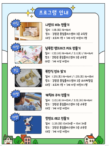 ▶ 나만의 비누 만들기(1회), 남북한 랜드마크 지도 만들기(2회), 북한식 만두 빚기(2회), 더함이다함이 캐릭터 쿠키 만들기(2회), 한반도 레고 만들기(1회)
