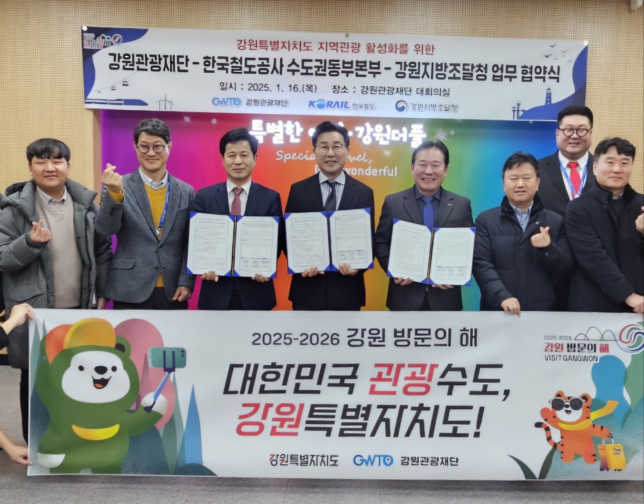 강원관광재단(대표이사 최성현)은 1월 16일, 코레일 수도권동부본부(본부장 김경재), 강원지방조달청(청장 이병철)과 함께 강원관광재단 대회의실에서 강원 지역관광 활성화를 위한 업무협약(MOU)을 체결했다고 밝혔다.