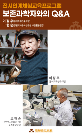 특히, 전시 개막일인 3월 15일(토)에는 이정우(동서조류연구소장)과 고형순(강원역사문화연구원 보존활용팀장) 국가유산수리기능자가 참여하는 학교연계프로그램 “보존과학자와의 Q&A” 세션이 진행된다. 이 프로그램은 학생들의 질문에 직접 답변하는 시간을 통해 미래 세대가 자연유산과 보존과학에 대한 이해와 관심을 높이는 데 기여할 것으로 기대된다.