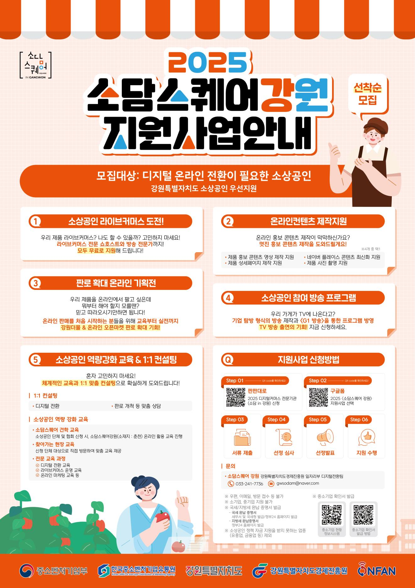 2025년 소담스퀘어 강원 지원 사업으로는 ▲역량 강화 교육 및 1:1 컨설팅 ▲라이브커머스 운영 ▲방송참여 프로그램 제작 ▲온라인 컨텐츠 제작 ▲온라인 기획전 외 맞춤형 스타소상공인 지원사업 등이 있다.