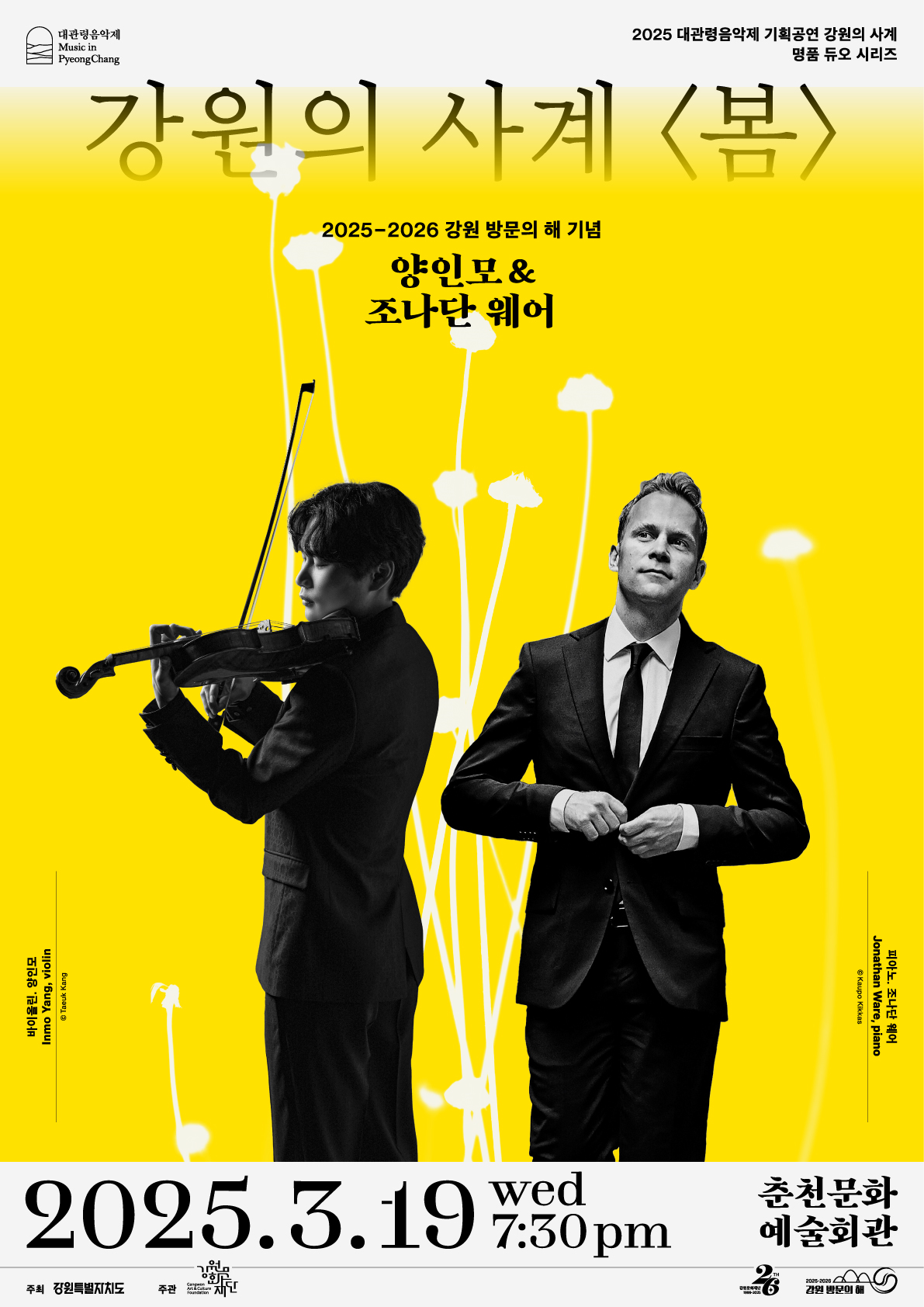 강원특별자치도(도지사 김진태, 이하 ’)‘2025~2026 강원 방문의 해를 맞아, 세계적인 바이올리니스트 양인모와 함께하는 양인모 & 조나단 웨어 듀오 리사이틀319() 오후 730분 춘천문화예술회관에서 개최한다. 본 공연은 강원의 사계라는 테마로 진행되는 첫 번째 공연으로, 봄을 맞아 클래식 음악의 아름다움을 선사할 예정이다.