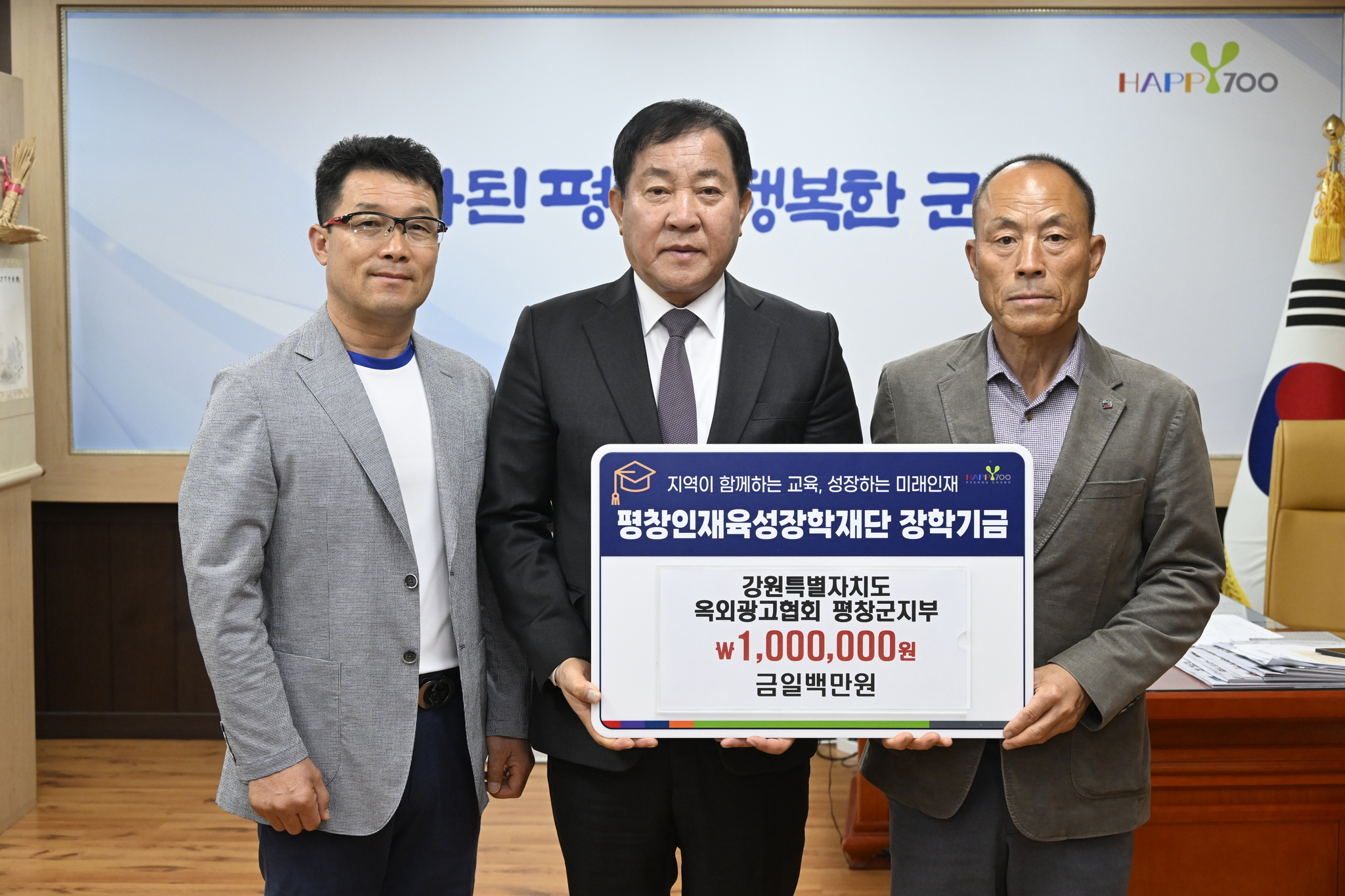 강원특별자치도옥외광고협회 평창군지부는 평창 지역의 옥외광고업체들로 구성된 단체로 지역사회의 미관 개선과 공공 안전을 위한 다양한 활동을 하고 있다. 그뿐만 아니라 평창인재육성장학재단 장학사업에 관심을 가지고 지난 2015년부터 2025년까지 재단에 기부해 온 누적 기부금은 총 1,100만 원에 이른다.