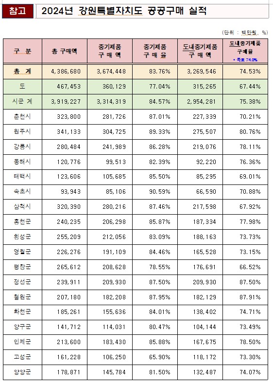 김만호 강원특별자치도 경제국장은 직접 우수 시군에 대한 시상을 진행하고, 인사말을 통해 “공공구매 제도가 트럼프 관세 등 대외 여건 악화 속에서도 도내 기업에 든든한 버팀목이 될 수 있도록, 일선 담당자 여러분의 적극적인 구매 추진과 실적 달성에 각별한 관심과 노력을 부탁드린다”고 말했다.