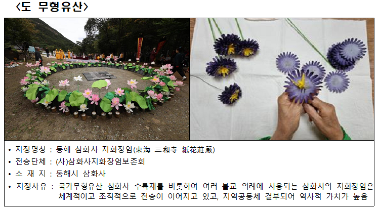 도등록문화유산과 등록과 함께 ‘동해 삼화사 지화장엄’도 도무형유산으로 지정된다. 삼화사 수륙재(국가무형유산)를 비롯한 불교 의례에 사용되는 지화장엄은 지역 공동체에서 체계적으로 전승돼 그 가치가 높게 평가된다.