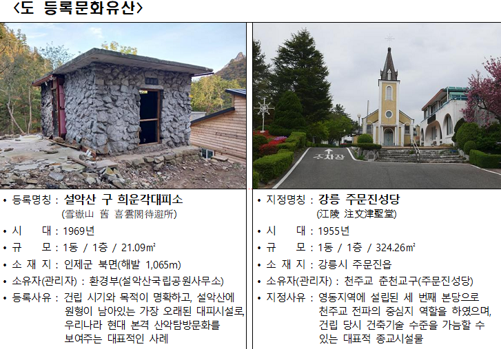 - ‘설악산 구 희운각대피소’와 ‘강릉 주문진성당’ 도등록문화유산으로 등록