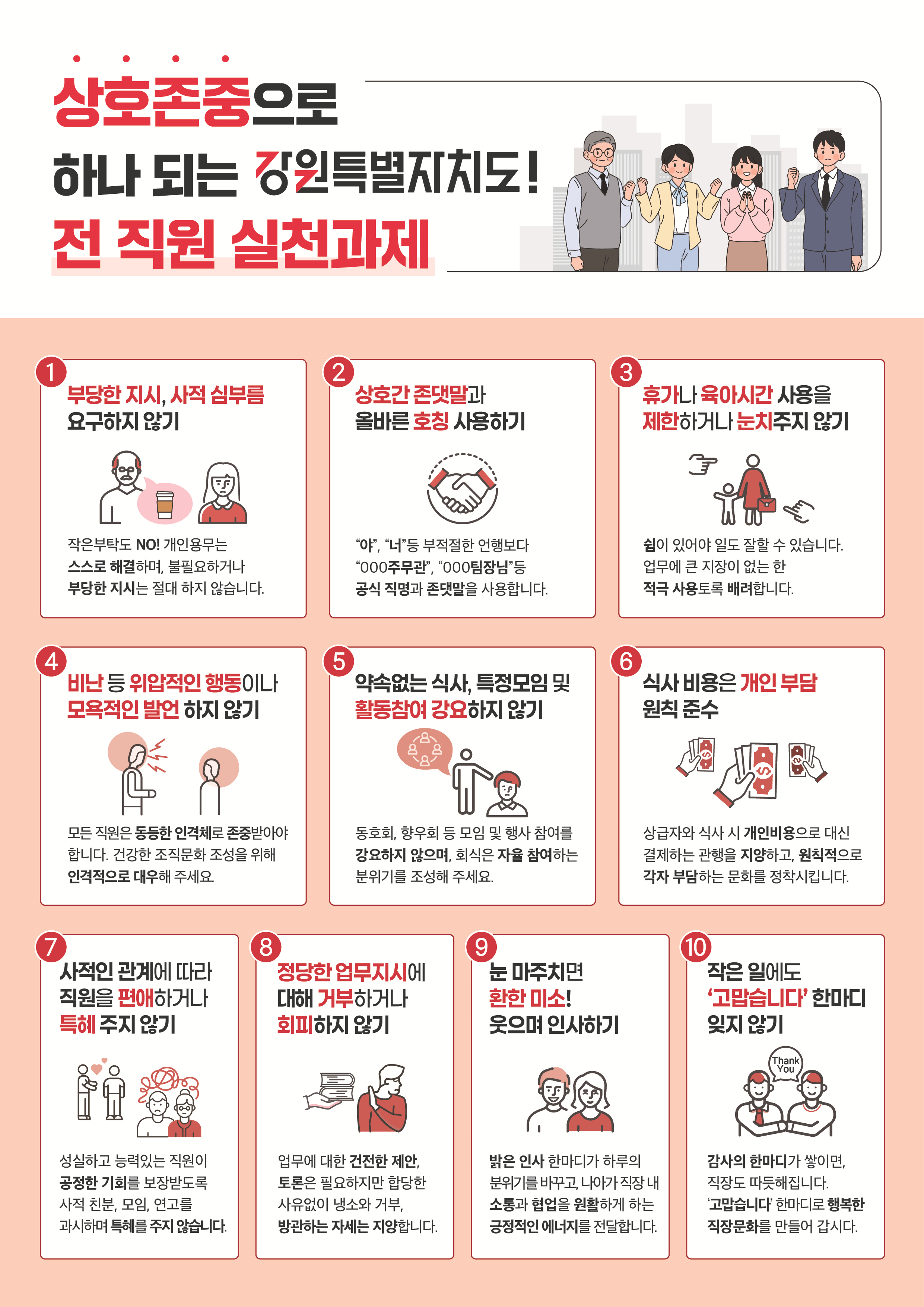 | ① 부당한 지시 및 사적 심부름 금지 ③ 휴가·육아시간 사용에 눈치주지 않기 ⑤ 식사 및 모임 참여 강요하지 않기 ⑦ 사적 친분으로 편애나 특혜 주지 않기 ⑨ 환한 미소와 웃으며 인사하기 |