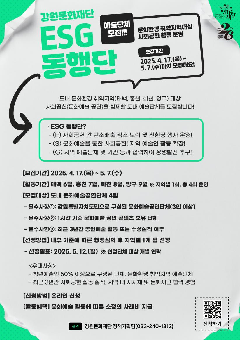 한편, <ESG 동행단>은 강원문화재단의 ESG경영에 맞춰 [E] 사회공헌 간 탄소배출 감소 노력과 친환경 행사 운영 [S] 지역 예술인의 활동 확장과 사회공헌 [G] 지역 예술단체 및 기관 등과 협력한 상생발전 등 ESG 실천 중심으로 운영될 예정이다.