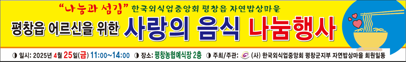 (사)한국외식업중앙회 평창군지부 평창자연밥상마을은 25일 11시 평창농협예식장 2층 피로연장에서 평창읍 어르신을 위한 사랑의 음식 나눔 행사를 개최했다.
