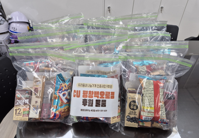 평창읍 우리동네나눔가게 8호점인 CU평창 백오로점(대표 김선미)은 4월 28일, 어려운 이웃을 위해 두유, 쿠키, 약과 등으로 구성된 간식꾸러미 15세트를 평창읍에 기탁했다.